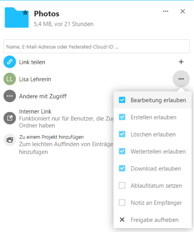 4. Über einen Klick auf die drei Punkte neben dem „Clipboard“ Symbol können Sie nun auch hier, ähnlich wie bei der Freigabe für Benutzer und Gruppen, die Berechtigungen und weitere Einstellungen anpassen.