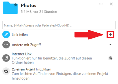 2. Um den Ordner/die Datei über einen Link zu Teilen müssen Sie nun auf das „+“ Symbol klicken (siehe Abbildung).