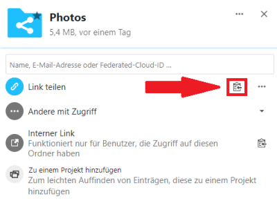 3. Nachdem Sie die Freigabe über den Link aktiviert haben können Sie über das „Clipboard“ Symbol (siehe Abbildung) den Link kopieren.